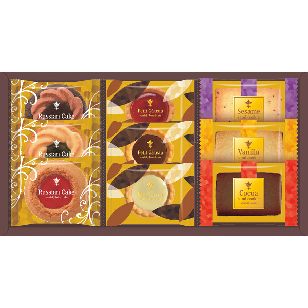 ●ロシアケーキ(マカロンストロベリー・フラワーキウイ・リッチビター×各1)、プチガトー(ストロベリー・ミルクチョコ・ホワイトチョコ×各1)、サンドクッキー(ココア・バニラ・セサミ×各1)