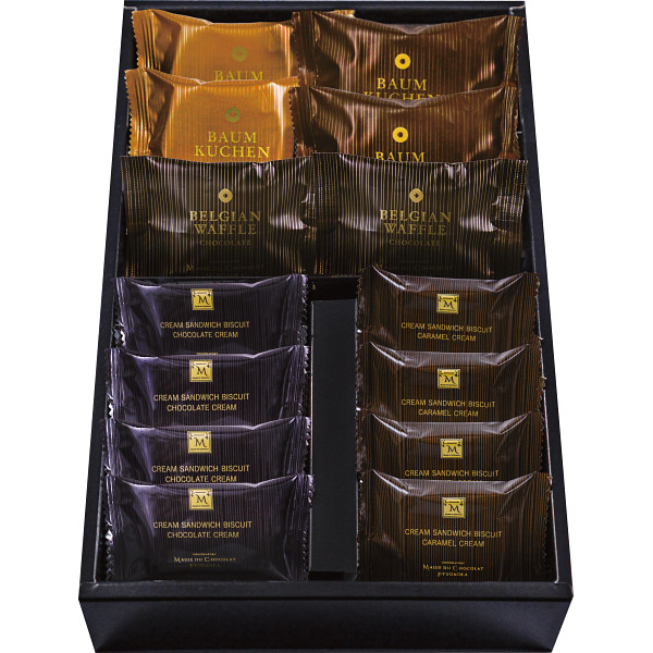 ●ベルギーワッフル(ショコラ)×2、バームクーヘン(ショコラ・ミルク)×各2、クリームサンドビスケット(ショコラ・キャラメル)×各4