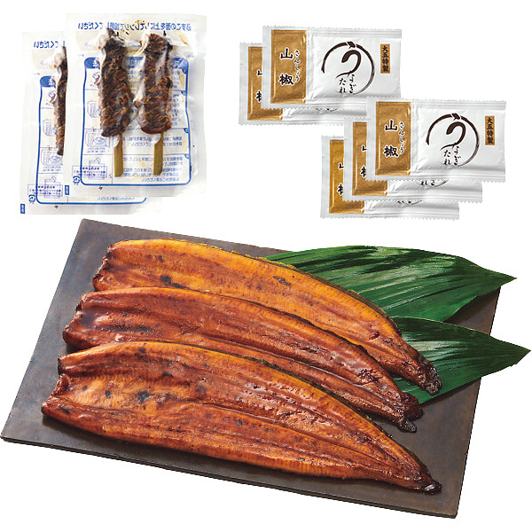 ●長蒲焼×3(計360g・真空個包装・うなぎ:宮崎県または静岡県産)、山椒付きタレ15ml×5、焼肝串30g×4※山椒付きタレ、焼肝串のパッケージデザインは変更になる場合がございます。