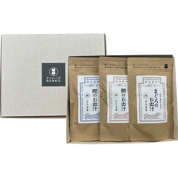 おいしい出汁3種類を詰め合わせました。『鰹のお出汁』は九州の鰹節をふんだんに使用し風味豊かな味と香りに仕上げました。『まぐろのお出汁』はまぐろ節をメインにブレンドしてあり、クセがなく素材の味を引き立ててくれるお出汁です。『鯛のお出汁』は上品なのにしっかりとしただしが出て、炊き込みご飯やだし茶漬けによく合うお出汁です。