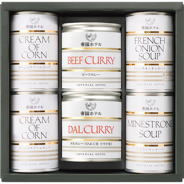 それぞれの野菜の特徴をいかして作り上げた帝国ホテルスープ3種と、スパイスの効いた具材の旨味引き立つ帝国ホテルカレー2種の缶詰ギフトです。